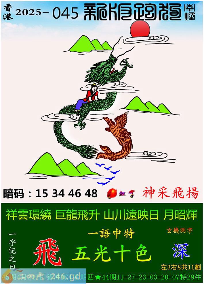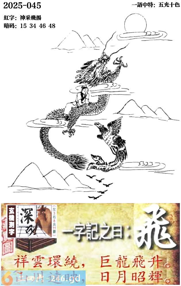 045期跑狗一字記之曰:【飛】 祥雲環繞,巨龍飛升。 山川遠映,日月昭輝。 玄機測字:《深》 一語中特:五光十色
