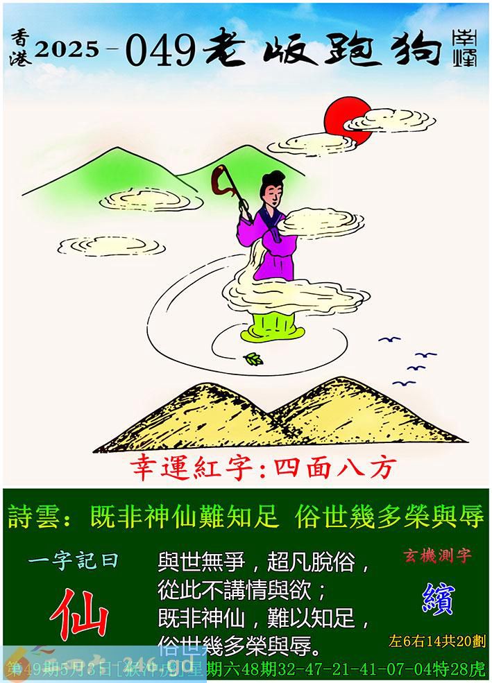 049期老版跑狗一字記之曰:【仙】 詩雲:既非神仙難知足,俗世幾多榮與辱。