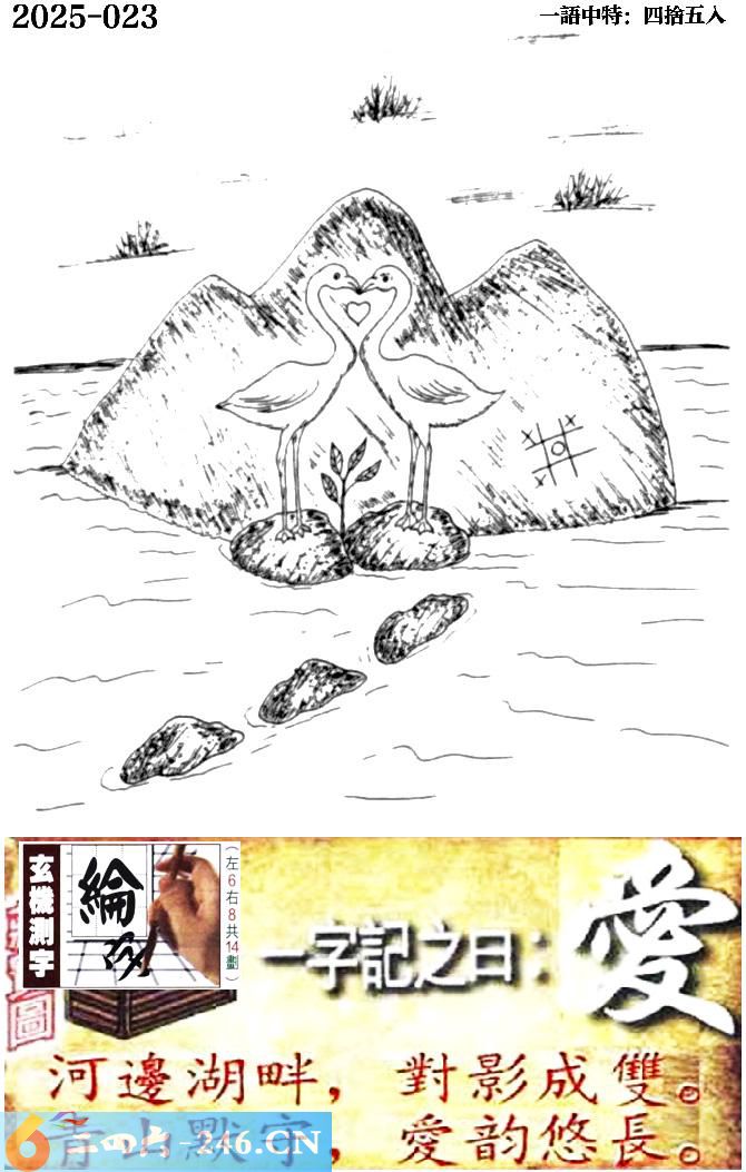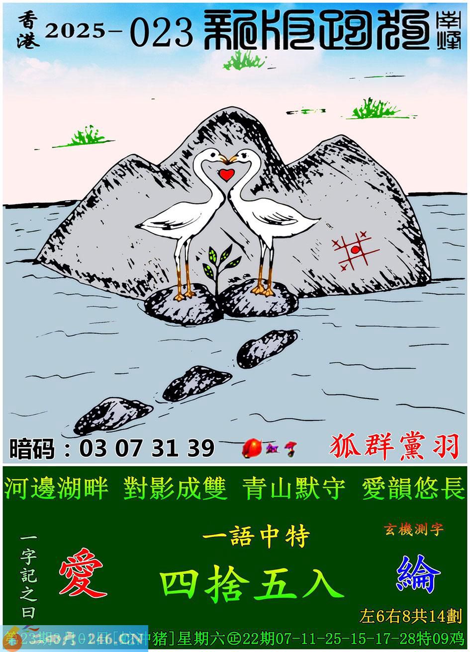 023期跑狗一字記之曰:【愛】 河邊湖畔,對影成雙。 青山默守,愛韻悠長。 玄機測字:《綸》 一語中特:四捨五入