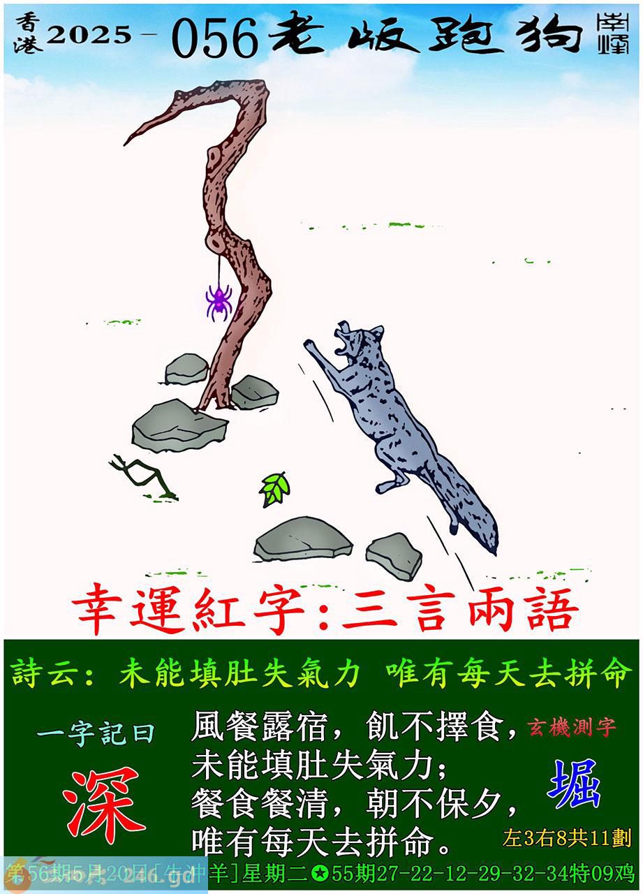 056期老版跑狗一字記之曰:【深】 詩雲:未能填肚失氣力,唯有每天去拼命。 風餐露宿,飢不擇食,未能填肚失氣力; 餐食餐清,朝不保夕,唯有每天去拼命。 玄機測字:《堀》