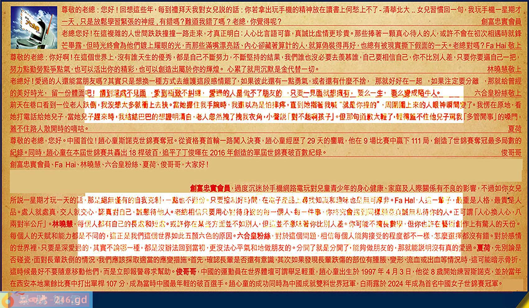 第058期《六合皇信箱文字版》10000%正確!!!正版二四六論壇*精心製作!!! 创富忠實會員、、林曉慧、六合皇粉絲、夏荷、俊哥哥,大家好! 【1】.尊敬的老總:您好!回想這些年,每到禮拜天我對女兒說的話:你若拿出玩手機的精神放在讀書上何愁上不了-清華北大..女兒習慣回句,我玩手機星期才二天,只是放鬆學習聚張的神經,有錯嗎?難道我錯了嗎?老總你覺得呢?創富忠實會員 〖創富忠實會员〗:過度沉迷於手機網路電玩對兒童青少年的身心健康、家庭及人際關係有不良的影響,不過如你女兒所說一星期才玩一天的話,那是絕無僅有的自我克制,一點也不過份。只要控制好時間,在電子產品上尋找知識和趣味也是無可非。 【2】.老總您好!在這複雜的人世間跌跌撞撞一路走來,才真正明白:人心比言語可靠,真誠比虛情更珍贵。那些捧著一顆真心待人的人,或許不會在初次相遇時就鋒芒畢露,但時光終會為他們鍍上耀眼的光,而那些滿嘴漂亮話、內心卻藏著算計的人,就算偽装得再好,也總有被現實撕下假面的一天。老總對嗎?敬上 〖〗:人這一辈子,最重是人格,最貴是人品。處人就處真,交人就交心,認真對自己,誠懇待他人。老總相信只要用心對待身邊的每一個人、每一件事,你終究會遇到同樣願意真誠無私待你的人。正可謂「人心换人心,八兩對半公斤」。 【3】.尊敬的老總:你好啊!在這個世界上,沒有誰天生的優秀,都是自己不斷努力,不斷堅持的結果,我們誰也沒必要去羨慕誰,自己要相信自己,你不比別人差,只要你要逼自己一把,努力點勤勞點爭點氣,也可以活出你的精彩,也可以創造出屬於你的輝煌。心累了就用沉默是金代替一切。林曉慧敬上 〖林曉慧〗:每個人都有自己的長處和短處。或許你在某些方面並不如別人,但這並不意味著你比別人差。你可能不擅長數學,但你也許在藝術創作上有驚人的天份。每個人的天賦和能力都是不同的,這正是我們這個世界如此五顏六色的原因。 【4】.老總好!爱過的人還能當朋友嗎?其實只是想換一種方式去維護這段感情罷了,如果彼此還有一點勇氣,或者還有什麼不捨,那就好好在一起,如果注定要分離,那就給曾經的美好時光,留一份體面吧!情到深成不见面,愛到極致不糾纏,愛過的人是做不了朋友的,只要見面就想擁有,要么一生,男么變成陌牛人。六合皇粉絲敬上 〖六合皇粉絲〗:對於這個問題,相信每個人能夠接受的程度都不一樣,怎麼選擇都沒有錯。對於感情的世界裡,只要是深愛過的,其實不論哪一種,都是沒辦法回到當初,更沒法心平氣和地做朋友的。分開了就是分開了,能夠做朋友的,那就能說明沒有真的愛過。 【5】.前天在巷口看到一位老人跌倒,我沒想太多就衝上去扶。當她握住我手腕時,我還以為是怕摔疼,直到她指著我喊“就是你撞的“,周圍圍上來的人眼神瞬間變了。我愣在原地,看她打電話給她兒子,當她兒子趕來時,我結結巴巴的想證明清白,老人忽然拽了拽我衣角小要說「對不起啊孩子」。但那句道歉大輕了,輕得蓋不住他兒子駡我「多管間事」的嗓門,蓋不住路人散開時的嘀咕。夏荷 〖夏荷〗:先別論是否碰瓷,面對長輩跌倒的情況,我們應該採取適當的應變措施。首先,確認長輩是否還有意識,其次如果發現長輩跌傷的部位有腫脹、變形、流血或出血等情況時,這可能暗示骨折,這時候最好不要隨意移動他們,而是立即報警尋求幫助。 【6】.尊敬的老總,您好。中國首位!趙心童斯諾克世錦賽奪冠。從資格赛首輪一路闖入決賽,趙心童經歷了29天的鏖戰,他在9場比賽中赢下111局,創造了世錦賽奪冠最多局數的紀錄。同時,趙心童在本届世錦賽共轟出18捍破百,追平了丁俊暉在2016年創造的單屆世錦賽破百數紀錄。俊哥哥 〖俊哥哥〗:中國的運動員在世界體壇可謂舉足輕重,趙心童出生於1997年4月3日,他從8歲開始練習斯諾克,並於當年在西安本地業餘比賽中打出單捍107分,成為當時中國最年輕的破百選手。趙心童的成功同時為中國成就雙料世界冠軍,白雨露於2024年成為首名中國女子世錦賽冠軍。 紅字:暴跳如雷 暗码:02061723 [释义]形容又急又怒,大发脾气的样子。 [出处]《古诗为焦仲卿妻作》:“我有亲父兄,性行暴如雷。”