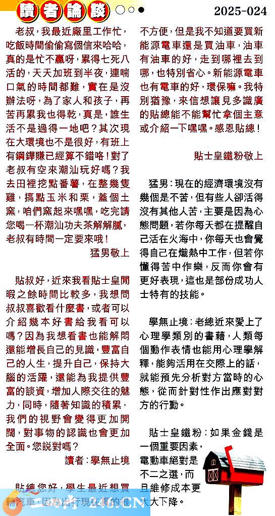 第零二四期讀者論談 1.老叔,我最近廠里工作忙,吃飯時間偷偷寫個信來哈哈真的是忙不赢呀,累得七死八活的,天天加班到半夜,連喘口氣的時間都難,實在是沒辦法呀,為了家人和孩子,再苦再累我也得乾,真是,誰生活不是過得一地吧?其次現在大環境也不是很好,有班上有鋼鏵賺已經算不錯咯!對了老叔有空來潮汕玩好嗎?我去田裡挖點番薯,在整幾隻雞,搞點玉米和栗,蓋個土窯,咱們窯起來嘿嘿,吃完請您喝一杯潮汕功夫茶解解腻,老叔有時間一定要來哦!猛男敬上 〖猛男〗:現在的經濟環境沒有幾個是不苦,但有些人卻活得沒有其他人苦,主要是因為心態問題,若你每天都在提醒自己活在火海中,你每天也會覺得自己在熾熱中工作,但若你懂得苦中作樂,反而你會有更好表現,這也是部份成功人士特有的技能。 2.貼叔好,近來我看貼士皇聞暇之餘時間比較多,我想問叔叔喜歡看什麼書或者可以介紹幾本好書給我看可以嗎?因為我想看書也能解悶還能增長自己的見識,豐富自己的人生,提升自己,保持大腦的活躍,還能為我提供豐富的談資,增加人際交往的魅力,同時,隨著知識的積累,我們的視野會變得更加開闊,對事物的認識也會更加全面。您說對嗎?讀者:學無止境 〖學無止境〗:老總近來愛上了心理學類別的書藉,人類每個動作表情也能用心理學解釋,能夠活用在交際上的話,就能預先分析對方當時的心態,從而針對性作出應對對方的行動。 3.貼總您好,學生最近想買輛汽車,因為出行現在真的很不方便,但是我不知道要買新能源電車還是買油車,油車有油車的好,走到哪裡去到哪,也特別省心。新能源電車也有電車的好,環保嘛。我特別猶豫,來信想讓見多識廣的貼總能不能幫忙拿個主意或介紹一下嘿嘿。感恩貼總!貼士皇鐵粉敬上 〖貼士皇鐵粉〗:如果金錢是一個重要因素,電動車絕對是中不二之選,而且維修成本更大大下降。