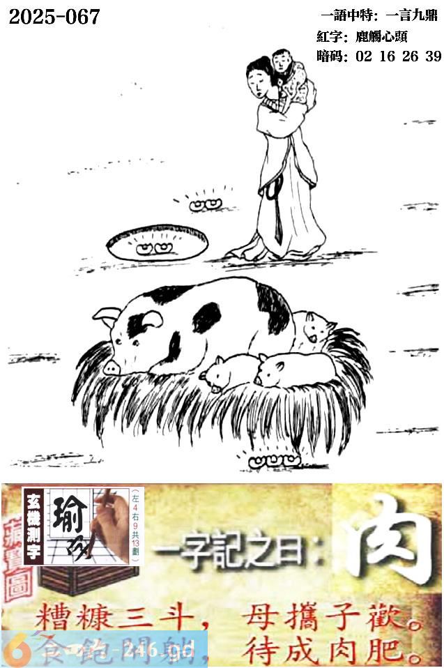 067期跑狗一字記之曰:【肉】 糟糠三鬥,母攜子歡。 食飽閑躺,待成肉肥。 玄機測字:《瑜》 一語中特:一言九鼎