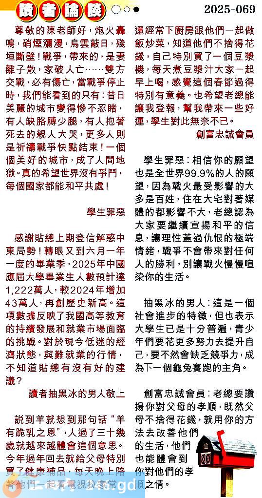 第零六九期讀者論談 1.尊敬的陳老師好,炮火轟鳴,硝煙獼漫,烏雲蔽日,殘垣斷壁!戰爭,帶來的,是妻離子散,家破......雙方交戰,必有傷亡,當戰爭停止時,我們能看到的只有:昔日美麗的城市變得慘不忍睹,有人缺胳膊少腿,有人抱著死去的親人大哭,更多人則是祈禱戰爭快點結束!一個個美好的城市,成了人間地獄。真的希望世界沒有爭鬥,每個國家都能和平共處!學生罪惡 〖學生罪惡〗:相信你的願望也是全世界99.9%的人的願望,因為戰火最受影響的大多是百姓,住在大宅對著媒體的都影響不大,老總認為大家要繼續宣揚和平的信息,讓理性蓋過仇恨的極端情緒,戰爭不會帶來對任何人的勝利,別讓戰火慢慢喧染你的生活。 2.感謝貼總上期登信解惑中東局勢!轉眼又到六月一年一度的畢業季,2025年中國應屆大學畢業生人數預計達1,222萬人,較2024年增加43萬人,再創歷史新高。這項數據反映了我國高等教育的持續發展和就業市場面臨的挑戰。對於現今低迷的經濟狀態,與難就業的行情,不知道貼總有沒有好的建議?讀者抽黑冰的男人敬上 〖抽黑冰的男人〗:這是一個社會進步的特徵,但也表示大學生已是十分普遍,青少年們要花更多努力去提升自己,要不然會缺乏競爭力,成為下一個龜兔赛跑的主角。 3.說到羊就想到那句話“羊有跪乳之恩”,人過了三十幾歲就越來越體會這個意思。今年過年回去就給父母特別買了健康補品,每天晚上陪著他們一起看電視拉家常,還經常下廚房跟他們一起做飯炒菜,知道他們不捨得花錢,自己特別買了一個豆漿機,每天煮豆漿汁大家一起早上喝,感覺這個春節過得特別有意義。也希望老總能讓我登報,幫我帶來些好運,學生對此無奈不已。創富忠誠會員 〖創富忠誠會員〗:老總要讚揚你對父母的孝順,既然父母不捨得花錢,就用你的方法去改善他們的生活,他們中也能體會到你對他們的孝順之情。