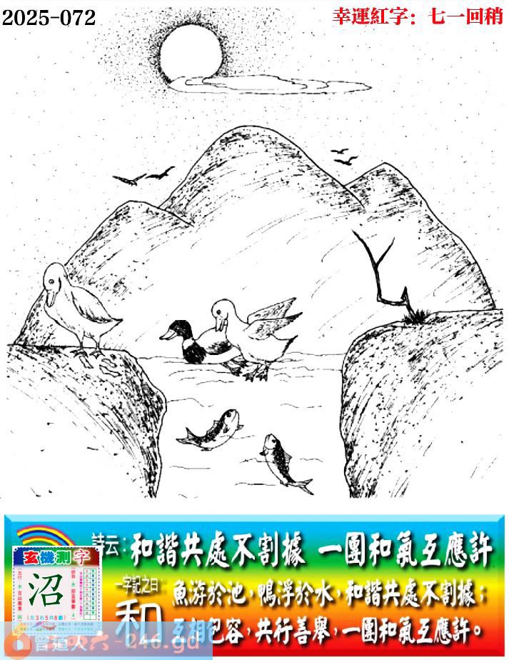 072期老版跑狗一字記之曰:【和】 詩雲:和諧共處不割據,一團和氣互應許。 魚游于池,鴨浮于水,和諧共處不割據; 互相包容,共行善舉,一團和氣互應許。 玄機測字:《沼》