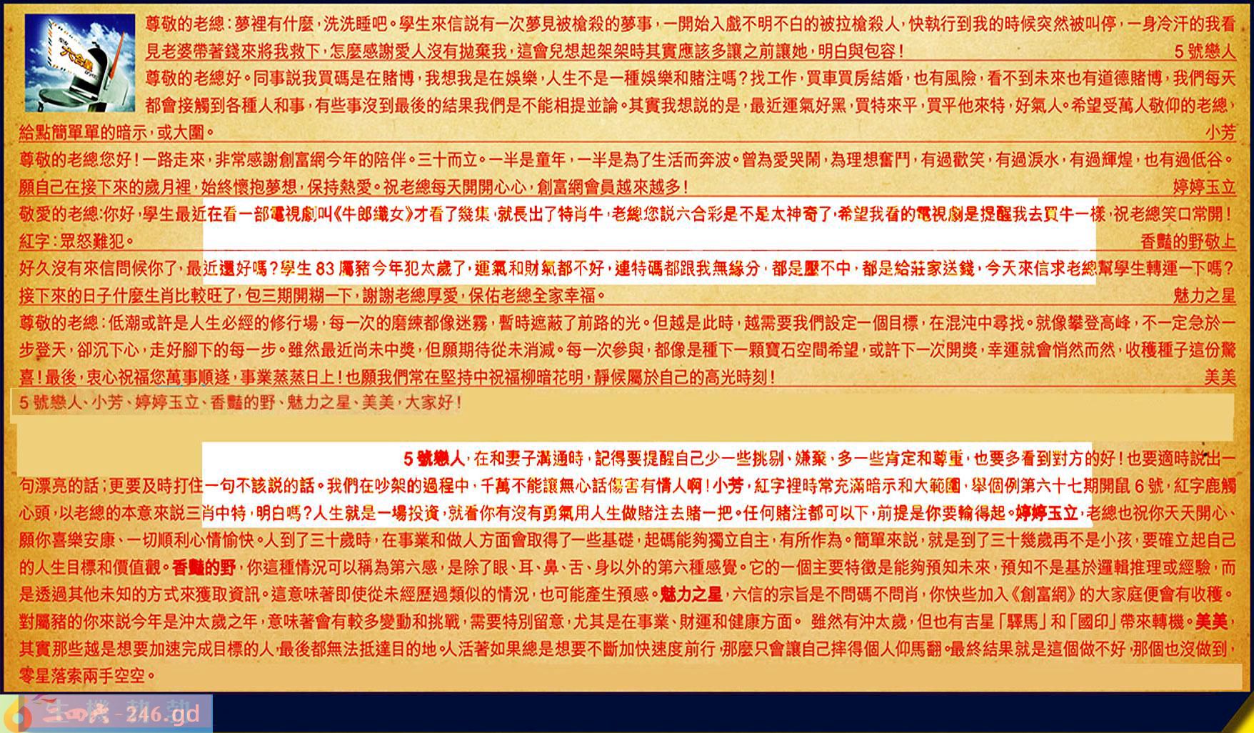 第072期《六合皇信箱文字版》10000%正確!!!正版二四六論壇*精心製作!!! 5號戀人、小芳、婷婷玉立、香豔的野、魅力之星、美美,大家好! 【1】.尊敬的老總:夢裡有什麼,洗洗睡吧。學生來信說有一次夢見被槍殺的夢事,一開始入戲不明不白的被拉槍殺人,快執行到我的時候突然被叫停,一身冷汗的我看見老婆帶著錢來將我救下,怎麼感謝愛人沒有抛棄我,這會兒想起架架時其實應該多讓之前讓她,明白與包容!5號戀人 〖5號戀人〗:在和妻子溝通時,記得要提醒自己少一些挑剔、嫌棄、多一些肯定和尊重,也要多看到對方的好!也要適時說出一句漂亮的話;更要及時打住一句不該說的話。我們在吵架的過程中,千萬不能讓無心話傷害有情人啊! 【2】.尊敬的老總好。同事說我買碼是在賭博,我想我是在娛樂,人生不是一種娛樂和賭注嗎?找工作,買車買房結婚,也有風險,看不到未來也有道德賭博,我們每天都會接觸到各種人和事,有些事沒到最後的結果我們是不能相提並論。其實我想說的是,最近運氣好黑,買特來平,買平他來特,好氣人。希望受萬人敬仰的老總,給點簡單單的暗示,或大圍。小芳 〖小芳〗:紅字裡時常充滿暗示和大範圍,舉個例第六十七期開鼠6號,紅字鹿觸心頭,以老總的本意來說三肖中特,明白嗎?人生就是一場投資就看你有沒有勇氣用人生做賭注去賭一把。任何赌注都可以下,前提是你要輸得起。 【3】.尊敬的老總您骄傲!一路走來,非常感謝創富網今年的陪伴。三十而立。一半是童年,一半是為了生活而奔波。曾為愛哭鬧,為理想奮鬥,有過歡笑,有過淚水,有過輝煌,也有過低谷願自己在接下來的歲月裡,始終懷抱夢想,保持熱爱。祝老總每天開開心心,創富網會員越來越多!婷婷玉立 〖婷婷玉立〗:老總也祝你天天開心、願你喜樂安康、一切順利心情愉快。人到了三十歲時,在事業和做人方面會取得了一些基礎,起碼能夠獨立自主,有所作為。簡單來說,就是到了三十幾歲再不是小孩,要確立起自己的人生目標和價值觀。 【4】.敬愛的老總:你好,學生最近在看一部電視劇叫《牛郎織女》才看了幾集,就長出了特肖牛,老總您说六合彩是不是太神奇了,希望我看的電視劇是提醒我去買牛一樣,祝老總笑口常開!紅字:眾怒難犯。香豔的野敬上 〖香豔的野〗:你這種情況可以稱為第六感,是除了眼、耳、鼻、舌、身以外的第六種感覺。它的一個主要特徵是能夠預知未來,預知不是基於邏輯推理或經驗,而是透過其他未知的方式來獲取資訊。這意味著即使從未經歷過類似的情況,也可能產生預感。 【5】.好久沒有來信問候你了,最近還好嗎?學生83屬豬今年犯太成了,運氣和財氣都不好,連特碼都跟我無緣分,都是应不中,都是給莊家送錢,今天來信求老總幫學生轉運一下嗎?接下來的日子什麼生肖比較旺了,包三期開糊一下,謝謝老總厚爱,保佑老總全家幸福。魅力之星 〖魅力之星〗:六信的宗旨是不問碼不問肖,你快些加入《創富網》的大家庭便會有收穫。對屬豬的你來說今年是沖太歲之年,意味著會有較多變動和挑戰需,要特別留意,尤其是在事業、財運和健康方面。雖然有沖太歲,但也有吉星「驛馬」和「國印」帶來轉機。 【6】.尊敬的老總:低潮或許是人生必經的修行場,每一次的磨練都像迷霧,暫時遮蔽了前路的光。但越是此時,越需要我們設定一個目標,在混沌中尋找。就像攀登高峰,不一定急於一步登天,卻沉下心,走好腳下的每一步。雖然最近尚未中獎,但願期待從未消減。每一次參與,都像是種下一顆寶石空間希望,或許下一次開獎,幸運就會悄然而然,收穫種子這份驚喜!最後,衷心祝福您萬事順遂,事業蒸蒸日上!也願我們常在堅持中祝福柳暗花明,靜候屬於自己的高光時刻!美美 〖美美〗:其實那些越是想要加速完成目標的人,最後都無法抵達目的地。以活著如果總是想要不斷加快速度前行,那麼只會讓自己摔得個人仰馬翻。最終结果就是這個做不好,那個也沒做到,零星落索兩手空空。 紅字:生機勃勃 暗码:06124145 [释义]形容自然界充满生命力,或社会生活活跃。 [出处]改革开放以来,我国的第三产业生机勃勃,发展非常迅速。