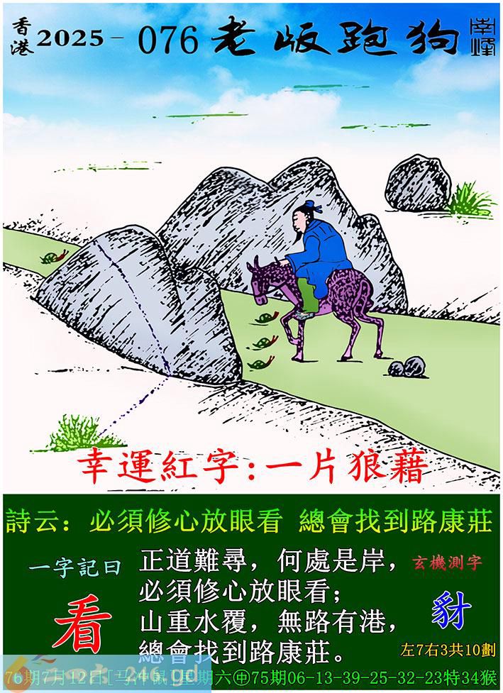 076期老版跑狗一字記之曰:【看】 詩雲:必須修心放眼看,總會找到路康莊。