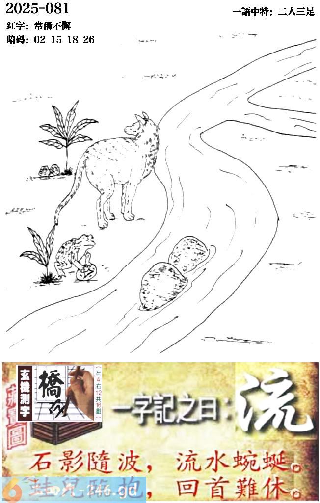 081期跑狗一字記之曰:【流】 石影隨波,流水蜿蜒。 蛙兒臨抱,回首難休。 玄機測字:《橋》 一語中特:二人三足