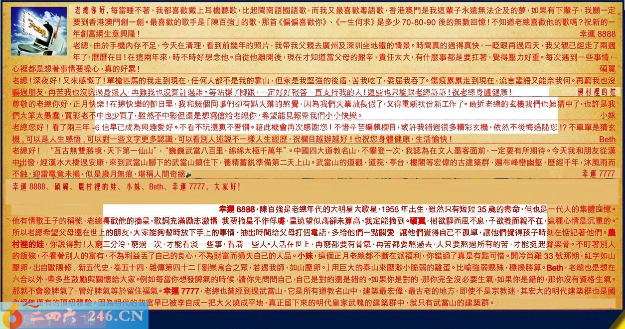 第026期《六合皇信箱文字版》10000%正確!!!正版二四六論壇*精心製作!!! 幸運8888、碩翼、農村裡的娃、小妹、、幸運7777,大家好! 【1】.老總您好!每當睡不著,我都喜歡戴上耳機聽歌,比起閩南語國語歌,而我又最喜歡粵語歌,香港澳門是我這輩子永遠無法企及的夢,如果有下輩子,我願一定要到香港澳門創一創。最喜歡的歌手是「陳百強」的歌,那首《偏偏喜歡你》、《一生何求》是多少70-80-90後的無數回憶!不知道老總喜歡他的歌嗎?祝新的一年創富網生意興隆!幸運8888 〖幸運8888〗:陳百強是老總年代的大明星大歌星:,1958年出生,雖然只有短短35歲的壽命,但也是一代人的集體回憶。他有情歌王子的稱號,老總喜歡他的摘星,歌詞充滿勵志激情,我要摘星不作俘虜,星遠望似高卻未算高,我定能摘到。 【2】.老總,由於手機內存不足,今天在清理,看到前幾年的照片,我帶我父親去廣州及深圳坐地鐵的情景。時間真的過得真快,一眨眼再過四天,我父親已經走了兩週年了,曆曆在目!在這兩年來,時不時好想念他。自從他離開後,現在才知道當父母的艱辛,責任太大,有什麼事都是要扛著,覺得壓力好重。每次遇到一些事情,心裡都是想著事情要操心,真的好累!碩翼 〖碩翼〗:樹欲靜而風不息,子欲養而親不在,這種心情是沉重的。所以老總希望父母還在世上的朋友,大家能夠暫時放下手上的事情,抽出時間給父母打個電話,多給他們一點關愛,讓他們覺得自己不孤單,讓他們覺得孩子時刻在惦記著他們。 【3】.老總!深夜好!又來感慨了!單槍匹馬的我走到現在,任何人都不是我的靠山,但家是我堅強的後盾,苦我吃了,委屈我吞了。傷痕累累走到現在,流言蜚語又能奈我何。再窮我也沒驅過朋友!再苦我也沒坑過身邊人,再難我也沒算計過誰。等站稞了腳跟,一定好好報答直支持我的人!這些也只能跟老總訴訴!祝老總身體健康!農村裡的娃 〖農村裡的娃〗:你說得對!人窮三分冷,窮過一次,才能看淡一些事,看清一些人。人活在世上,再窮都要有骨氣,再苦都要熬過去,人只要熬過所有的苦,才能挺起脊梁骨。不盯著別人的飯碗,不看著別人的富有,不為利益丟了自己的良心,不為財富而損失自己的人品。 【4】.尊敬的老總你好,正月快樂!在這快樂的節日里,我和幾個同事們卻有點失落的感覺,因為我們失業放長假了,又得重新找份新工作了。最近老總的玄機我們也難猜中了,也許是我們太笨太愚蠢,贾彩老不中也少買了,雖然不中彩但還是想寫信給老總你,希望能見報帶我們小小快樂。小妹 〖小妹〗:這個正月老總都不斷在派福利,你錯過了真是有點可惜。開冷肖雞33號那期,紅字如山壓卵,出自歐陽修。新五代史·卷五十四雜傳第四十二「劉崇烏合之眾,若遇我師如山壓卵。」用巨大的泰山來壓渺小脆弱的雞蛋。比喻強弱懸殊,穩操勝算。 【5】.老總您好!看了兩三年-6信早已成為興趣爱好。不看不玩還真不習惯。藉此機再次感謝您!不惜辛苦編輯欄目,或許我錯過很多精彩玄機,依然不後梅追隨您!?不單單是猜玄機,可以是人生感悟,可以對一些文字更多認識,可以看別人述說不一樣人生經歷,祝欄目越辦越好!也祝您身體健康,生活愉快! 〖〗:老總也是想在六合以外,帶多些鼓勵與關懷給大家,例如每當你想發脾氣的時候,請你先問問自己,自己是對的還是錯的。如果你是對的那你完全沒必要生氣,如果你是錯的,那你沒有資格生氣。那就不會發脾氣了,管好脾氣等於留住福氣。 【6】.老總好!“亙古無雙勝境,天下第一仙山”,“巍巍武當八百里,綿綿太極千萬年”。中國四大道教名山,不攀登一次,我認為在文人墨客面前,一定要有所期待。今天我和朋友從漢中出發,經漢水大橋過安康,來到武當山脚下的武當山镇住下,養精蓄銳準備第二天上山。武當山的道觀、道院、亭台、樓閣等宏偉的古建築群,遍布峰巒幽壑,歷經千年,沐風雨而不蝕,迎雷電竟未损,似是歲月無痕,堪稱人間奇絕。幸運7777 〖幸運7777〗:老總也曾經到過武當山,它是所有道教名山中,建築最宏偉、最古老的地方,即使不是宗教迷,其宏大的明代建築群也是國內絕無僅有的頂級體驗。因為明代的故宫早已被李自成一把大火燒成平地,真正留下來的明代皇家武魄的建築群中,就只有武當山的建築群。 紅字:麟子鳳雛 暗码:04193742 [释义]比喻年轻的颖异俊秀之人。 [出处]汉·焦延寿《易林》卷二:“麟子凤雏,生长家国。”