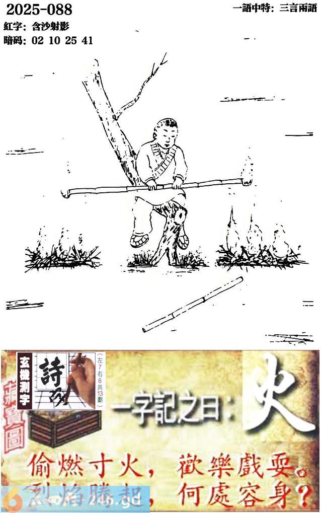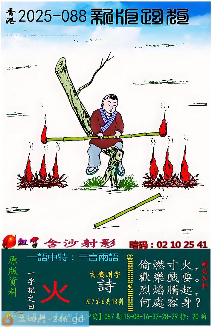 088期跑狗一字記之曰:【火】 偷燃寸火,歡樂戲耍。 烈焰騰起,何處容身? 玄機測字:《詩》 一語中特:三言兩語