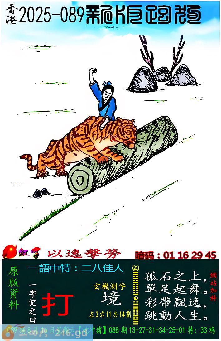 089期跑狗一字記之曰:【打】 惡虎攔途,壯士怒呼。 拳打妖物,孽障當除。 玄機測字:《境》 一語中特:二八佳人