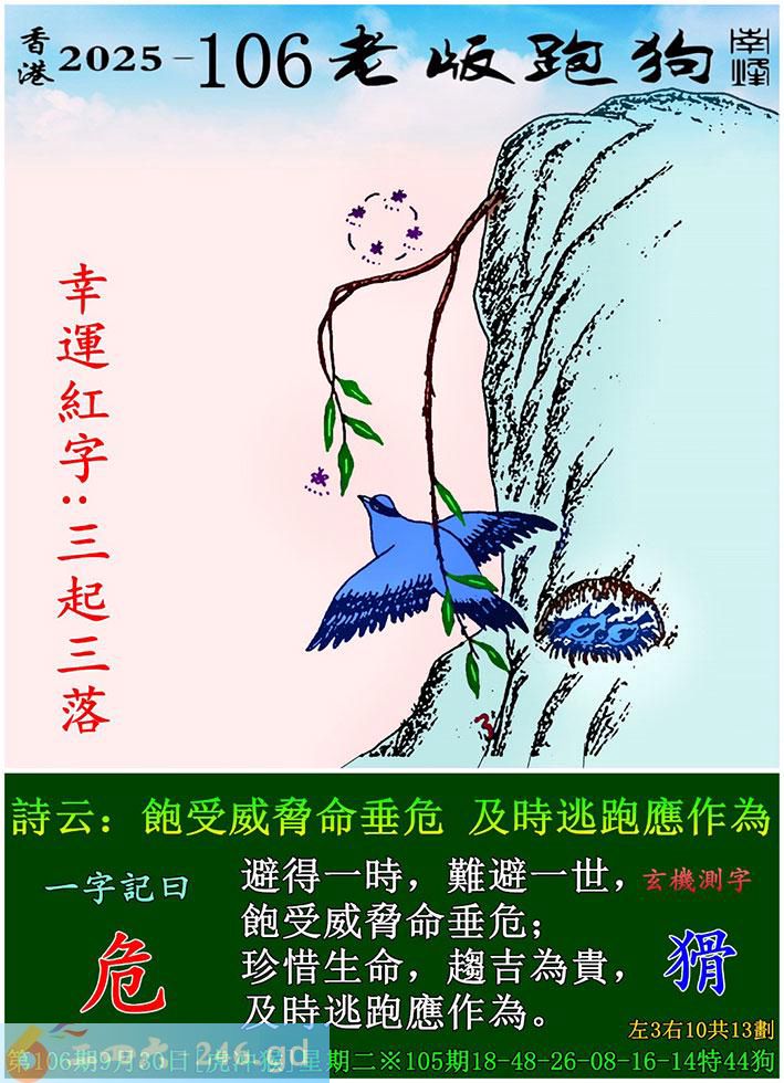 106期老版跑狗一字記之曰:【危】 詩雲:飽受威脅命垂危,及時逃跑應作為。