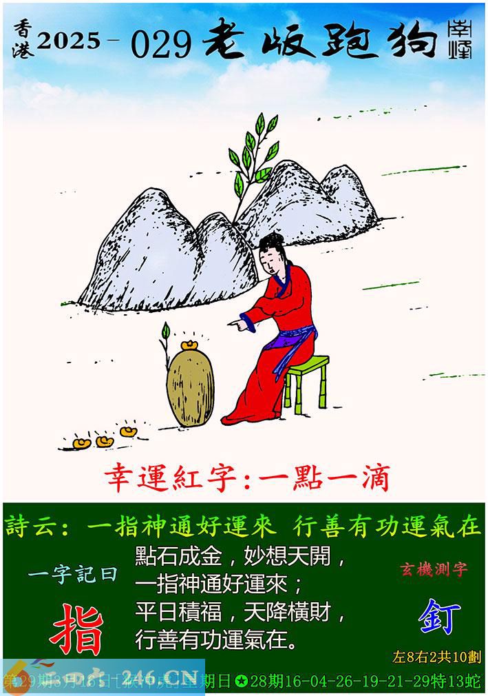 029期老版跑狗一字記之曰:【指】 詩雲:一指神通好運來,行善有功運氣在。