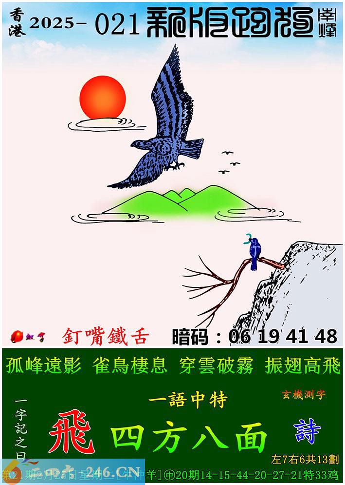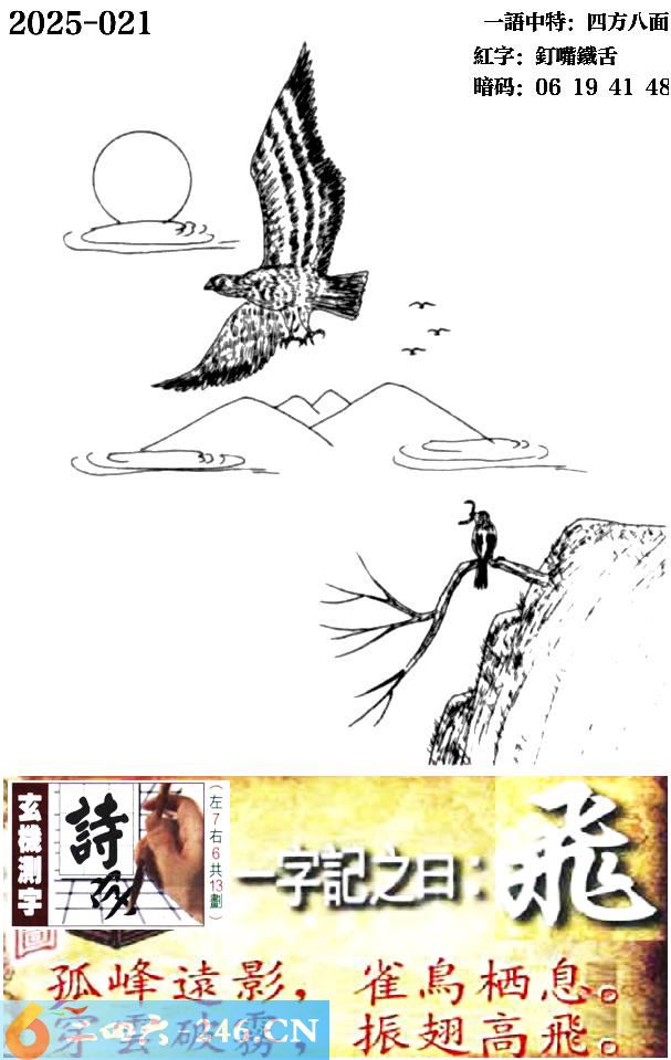 021期跑狗一字記之曰:【飛】 孤峰遠影,雀鳥棲息。 穿雲破霧,振翅高飛。 玄機測字:《詩》 一語中特:四方八面