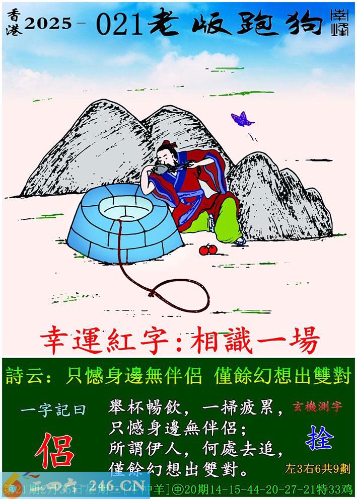 021期老版跑狗一字記之曰:【侶】 詩雲:只憾身邊無伴侶,僅餘幻想出雙對。 舉杯暢飲,一掃疲累,只憾身邊無伴侶; 所謂伊人,何處去追,僅餘幻想出雙對。 玄機測字:《拴》