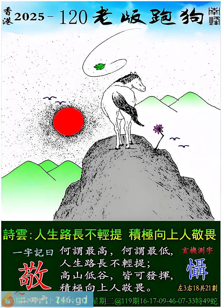 120期老版跑狗一字記之曰:【敬】 詩雲:人生路長不輕提,積極向上人敬畏。