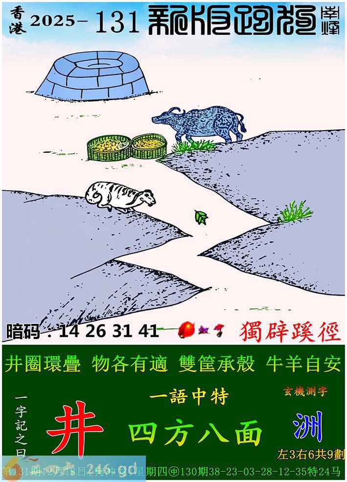 131期跑狗一字記之曰:【井】 井圈環疊,物各有適。 雙筐承殼,牛羊自安。