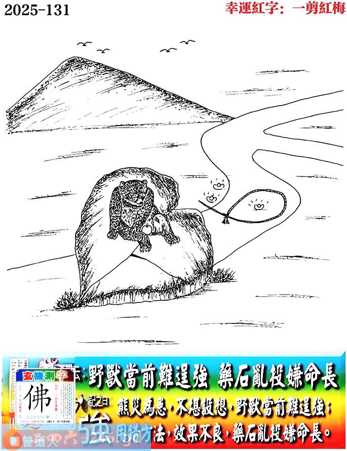 131期老版跑狗一字記之曰:【強】 詩雲:野獸當前難逞強,藥石亂投嫌命長。 熊災為患,不堪設想,野獸當前難逞強; 用錯方法,效果不良,藥石亂投嫌命長。 玄機測字:《佛》
