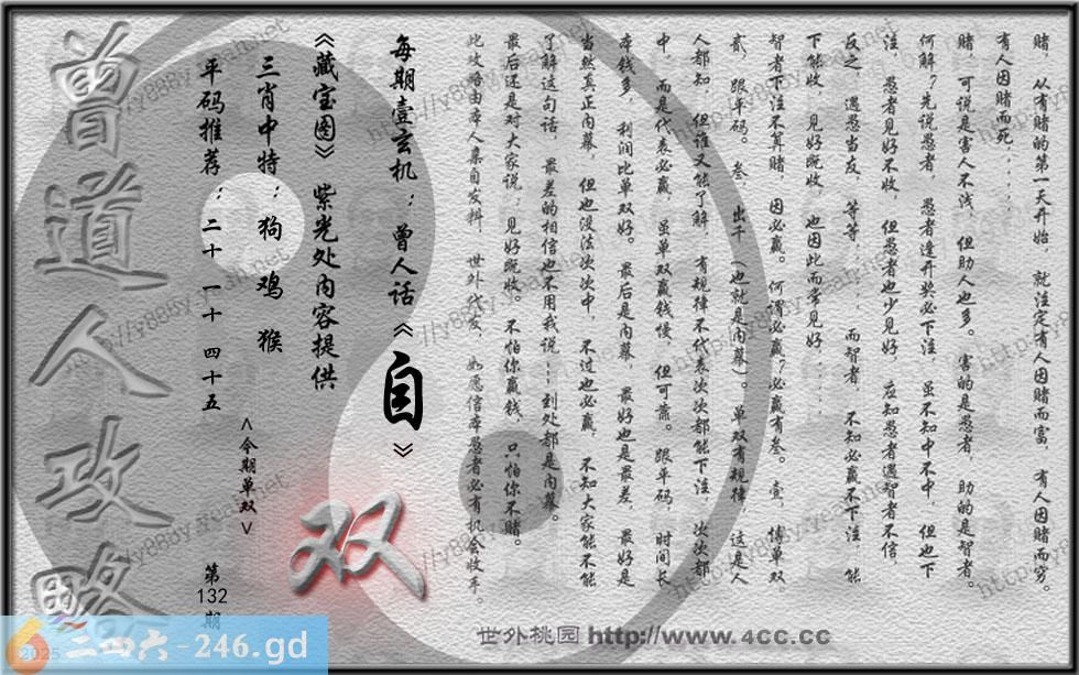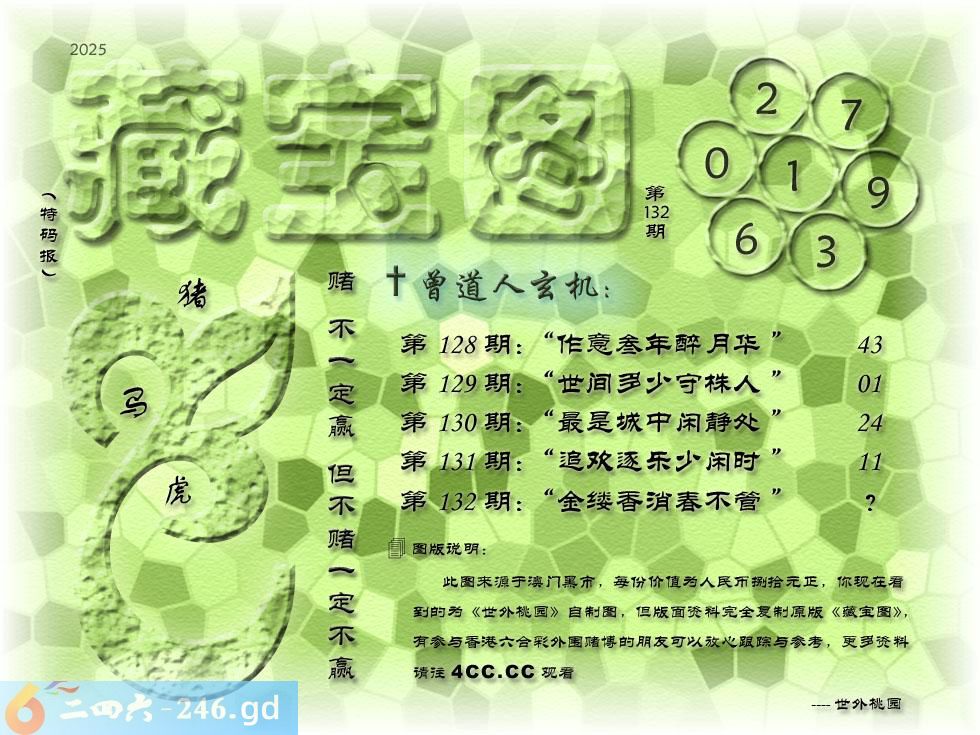 132期藏寶圖 新:金缕香消春不管 老:留住玖华云壹片 禁:鼠 禁:4尾 玄機字:《自》
