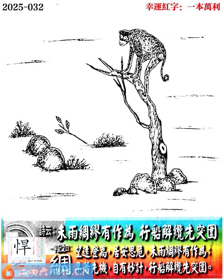 032期老版跑狗一字記之曰:【綢】 詩雲:未雨綢繆有作為,行船解纜先突圍。
