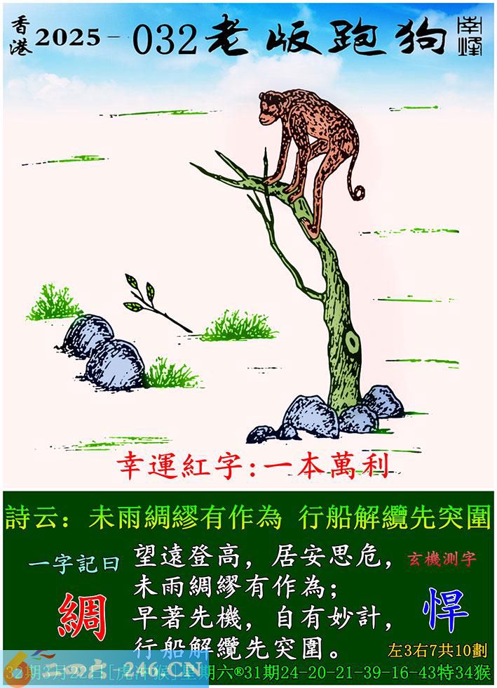 032期老版跑狗一字記之曰:【綢】 詩雲:未雨綢繆有作為,行船解纜先突圍。 登高望遠,居安思危,未雨綢繆有作為; 早著先機,自有妙計,行船解纜先突圍。 玄機測字:《悍》