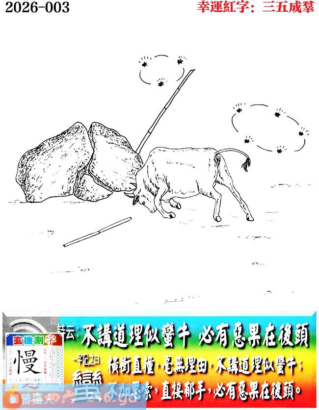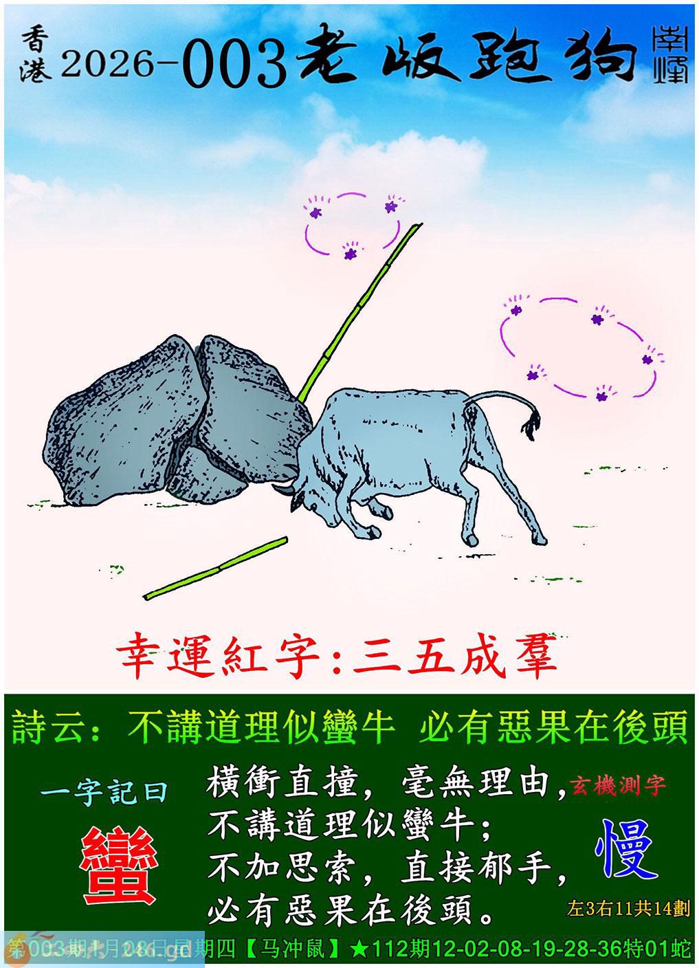 003期老版跑狗一字記之曰:【蠻】 詩雲:不講道理似蠻牛,必有惡果在後頭。 橫衝直撞,毫無理由,不講道理似蠻牛; 不加思索,直接郁手,必有惡果在後頭。 玄機測字:《慢》