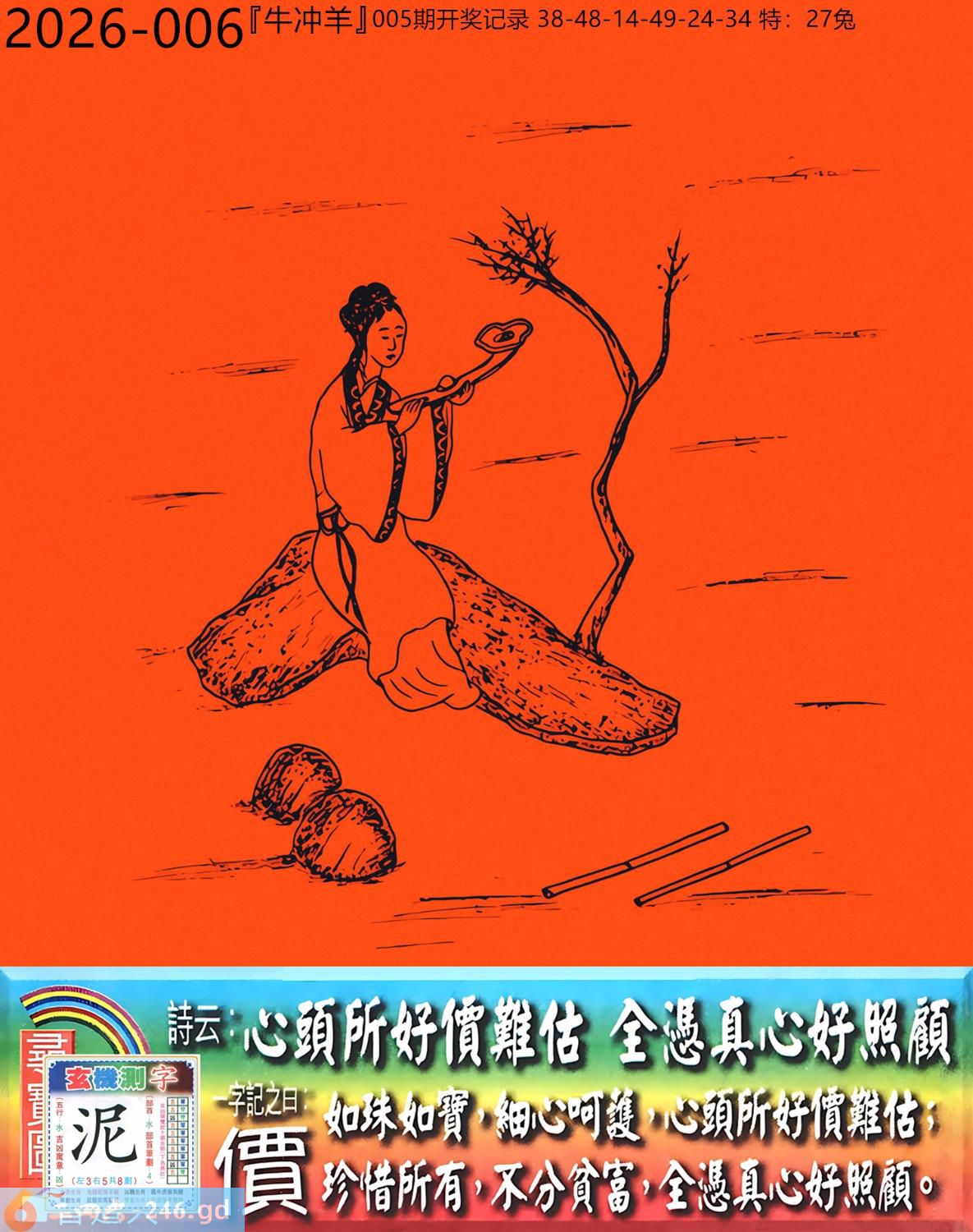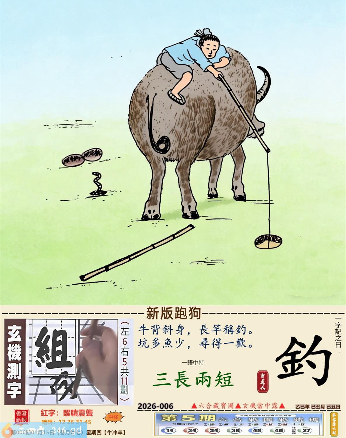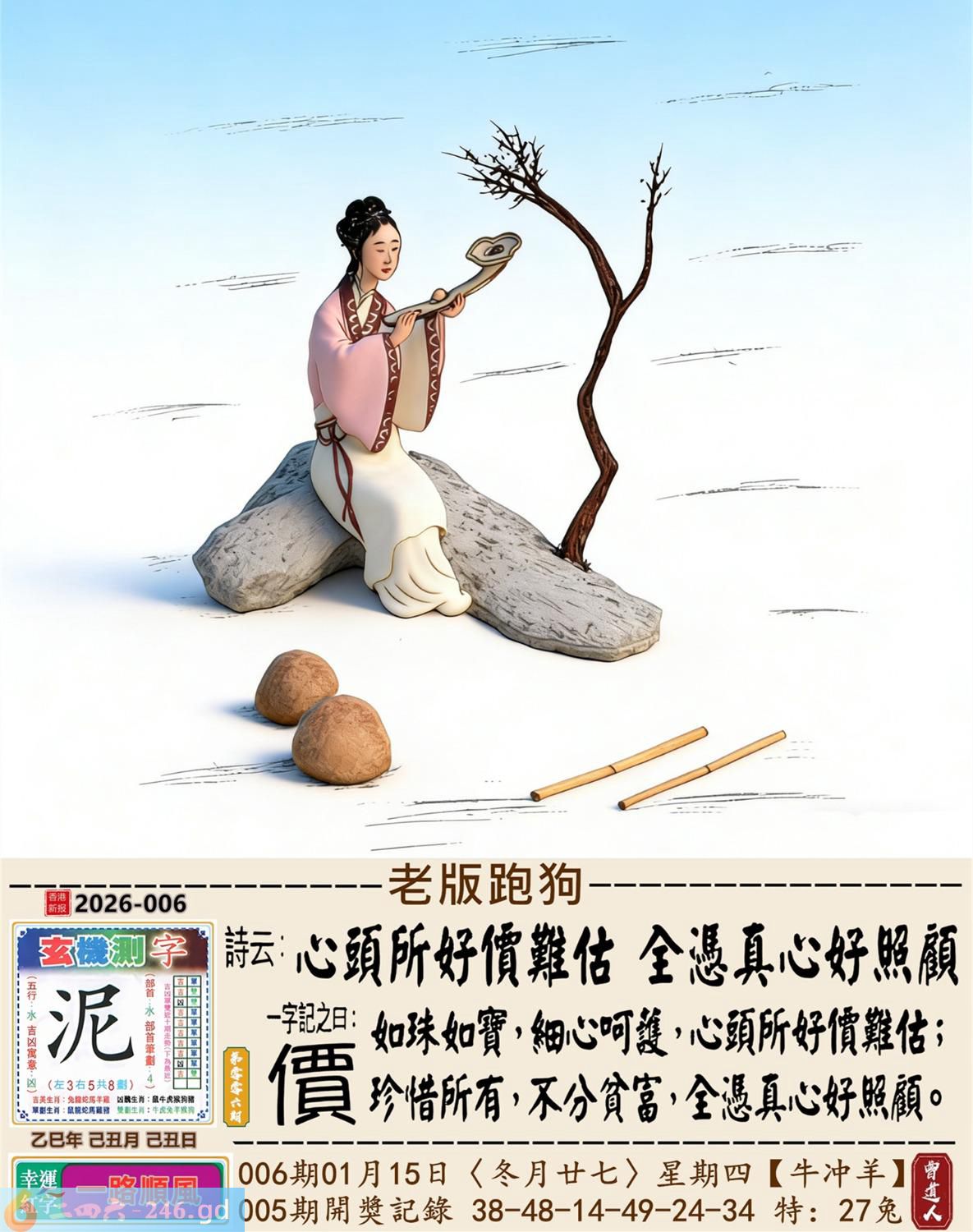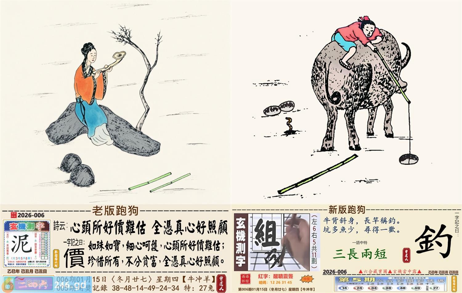 2026年1月15日006期羊(癸未)(霹雷火) 006期:老版跑狗玄機一字記之曰:【價】 詩云:心頭所好價難估全憑真心好照顧 如珠如寶,細心呵護,心頭所好價難估: 珍惜所有,不分貧富,全憑真心好照顧。 玄機測字:《泥》 密圖詩:有七有八出紅波 《記》:來回三局敗一地 特碼大小單雙句:非驢非馬 今期必中:趙雲 006期:特碼歇后語 锯子锯掉烂木头-----摧枯拉 006期正版四字梅花诗:势不可当。 006期火车头:烧伤牛。诗:虎死兔伤,十二合一特码出。 006期香港第一手欲钱料:石头? 006期曾道人说:“龙?” 006期另版四字梅花诗:西施特码。 006期香港第一手欲钱料:欲钱看一九九八同期的开奖结果。 006期曾道人说:“为什么地球会转”? 006期:二字經:七八 006期:井底有特码 006期:智力金壤;张灯结彩 006期:信箱紅字:【醒聵震聾】 006期:【暗碼:12-26-31-45】 006期:一語中特:【三長兩短】 發財玄機圖:憨頭憨腦可愛懶惰圖中明豬藍綠 006期:藏寳圖 新:欲往宁辞沔水深 老:水鸡衔鱼来去飞 禁:猴禁:4尾玄机字《样》 2026年006期【生活幽默】版 〖什么東西〗 公交車,不讓乘客帶寵物和動物上車。 一個老太太把一活公鷄装到布兜子裹,帶上了車!車上能有20多人,老太太剛找到座位坐好,公把頭伸了出來,打了一個清脆的鳴!把司機嚇了一跳,車上的乘客都知道是怎回事,司機:什東西?老太太迅速把鷄頭按回袋子裹,説了一聲:是手機鈴聲!