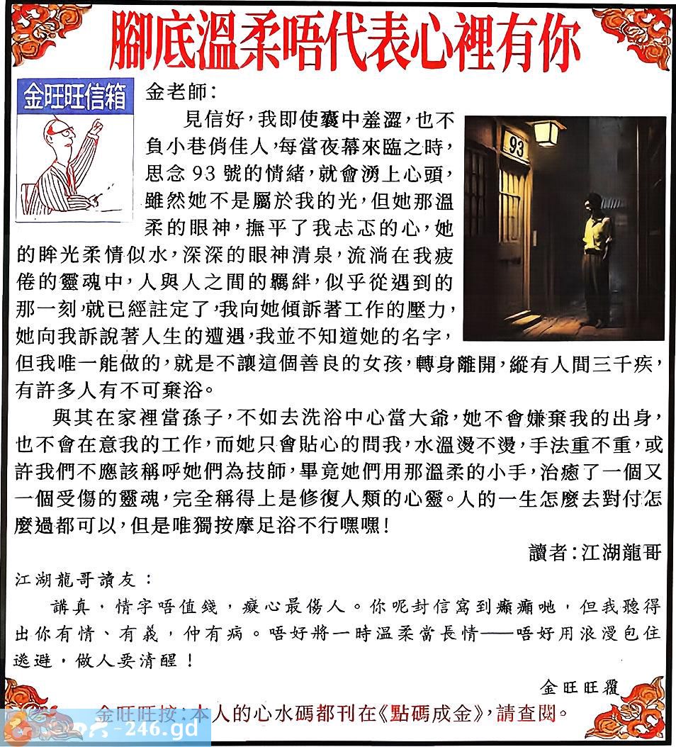 007期:金旺旺信箱彩民推荐→→《腳底溫柔唔代表心裡有你》