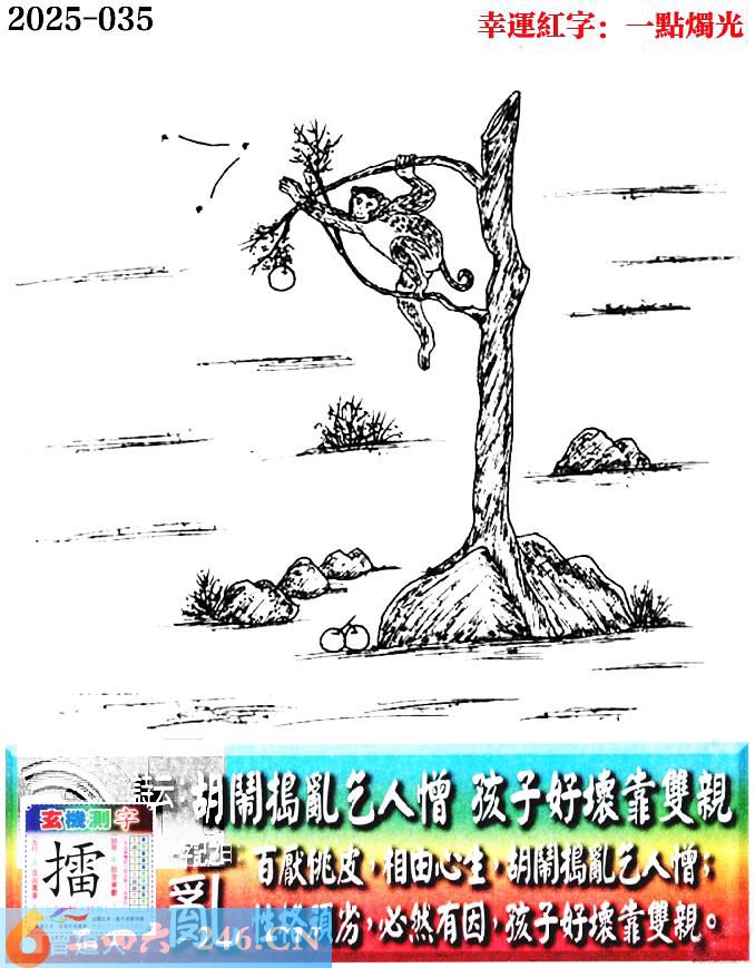 035期老版跑狗一字記之曰:【亂】 詩雲:胡鬧搗亂乞人憎,孩子好壞靠雙親。 百厭佻皮,相由心生,胡鬧搗亂乞人憎; 性格頑劣,必然有因,孩子好壞靠雙親。 玄機測字:《擂》