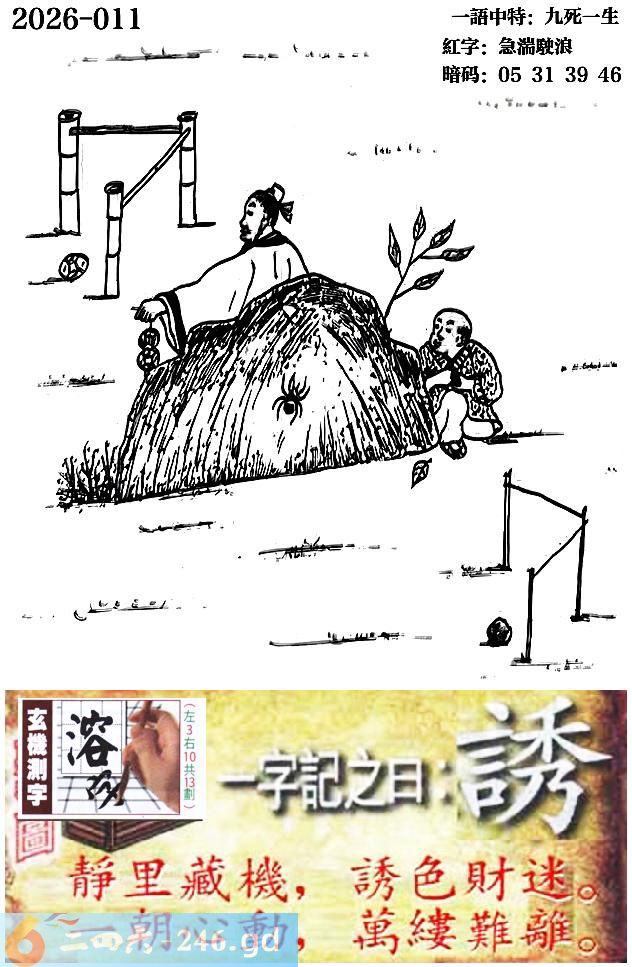 011期跑狗一字記之曰:【誘】 靜裏藏機,誘色財迷。 一朝心動,萬縷難離。 玄機測字:《溶》 一語中特:九死一生