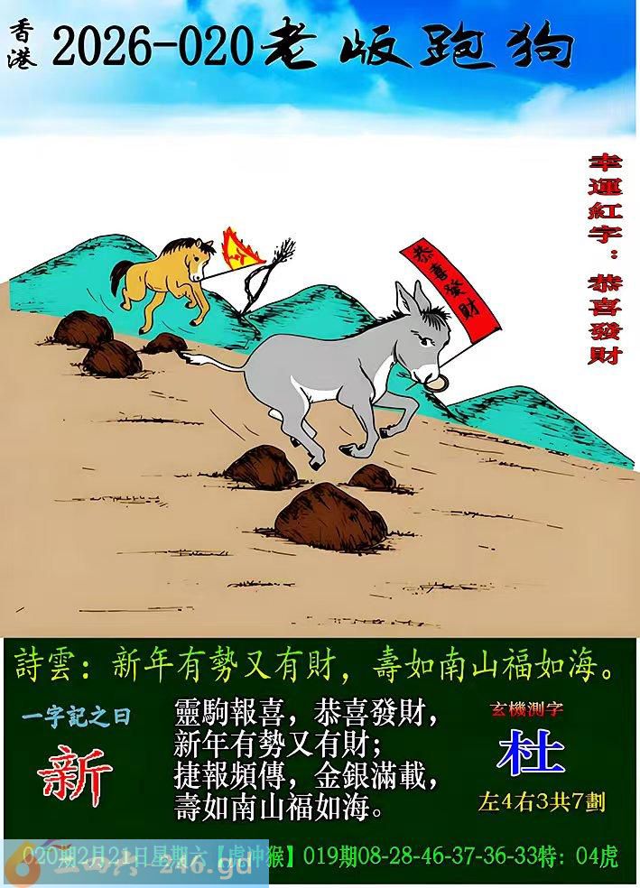 2026年2月21日020期侯(庚申(炉中火) 020期:老版跑狗玄機一字記之曰:【新】 詩云:新年有勢又有財壽如南山福如海 靈駒報喜,恭喜發財,新年有勢又有財; 捷報頻傳,金銀滿載,壽如南山福如海。 玄機測字:《杜》 密圖詩:一男一女相伴隨 《記》:一左一右都是二 特碼大小單雙句:三心二意相互應 今期必中:貂禪 020期:特碼歇后語 河里捉王八-----(捉)作弊(鳖) 020期四字梅花诗:言不由衷。 020期火车头:烧伤猪。诗:龙死马伤,三六一二比短长。 020期香港第一手欲钱料:蛇。 020期曾道人说:“年月日?” 020期另版四字梅花诗:三番五次。 020期香港第一手欲钱料:欲钱看一九九八年第一百三十期。 020期曾道人说:“为什么电视没冇天线还可以正常播放”? 020期:二字經:人間 020期:夏至是特码 020期:智力金壤;杏雨梨云 020期:信箱紅字:【攀炎附熱】 020期:【暗碼:21-35-41-46】 020期:一語中特:【六六無窮】 發財玄機圖:變化多端窗外風景圖中明龍藍綠 020期:藏寳圖 新:可能同读远游无 老:坐客无毡醉不知 禁:猴禁:7尾玄機字《套》 2026年020期【生活幽默】版 〖快樂的寡婦〗 劇院開戲前,一群美國中老年婦女嘻哈聊天,好不熱鬧。 其中一位覺得同伴太吵,有點過意下去,便對身旁的布朗先生道歉:"對不起,我們實在太快樂了。你知道嗎?我認識她們好幾十年了,她們的先生都去世了。他們自稱快樂的寡婦,每年自組出外旅游玩一玩。我一直很想加入這個團體,可是,一直至今年春天,我才具備入會的資格。"