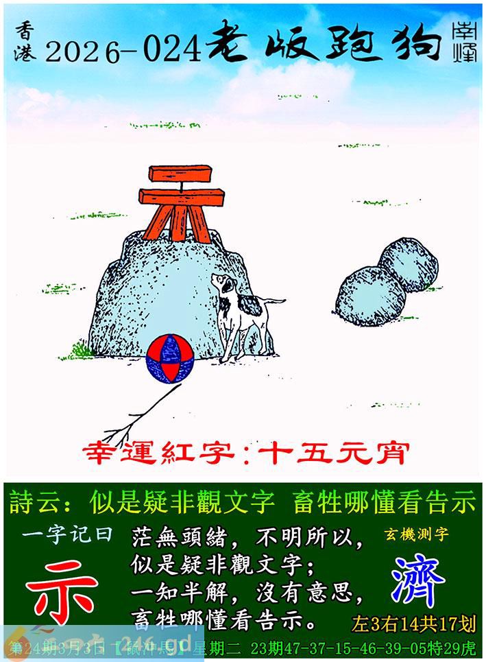 024期老版跑狗一字記之曰:【示】 詩雲:似是疑非觀文字,畜牲哪懂看告示。