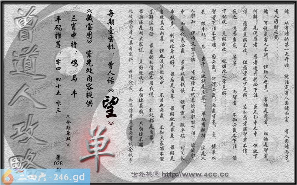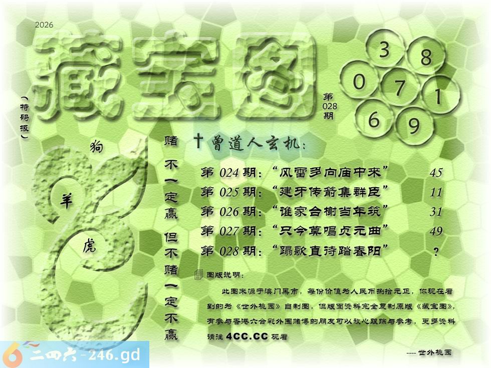 028期藏寶圖 新:蹋歌直待踏春阳 老:要试煎茶第壹功 禁:猪 禁:2尾 玄機字:《望》