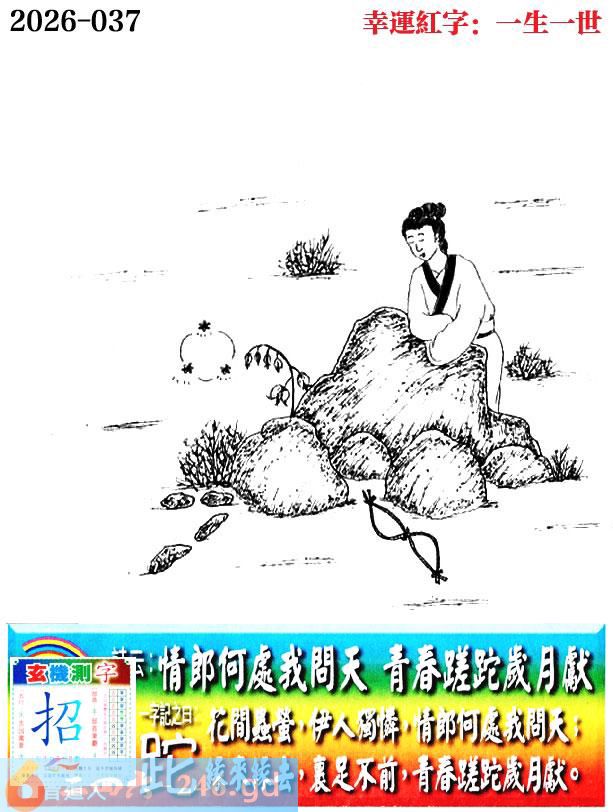 037期老版跑狗一字記之曰:【跎】 詩雲:情郎何處我問天,青春蹉跎歲月獻。 花間蟲螢,伊人獨憐,情郎何處我問天; 緣來緣去,裹足不前,青春蹉跎歲月獻。 玄機測字:《招》