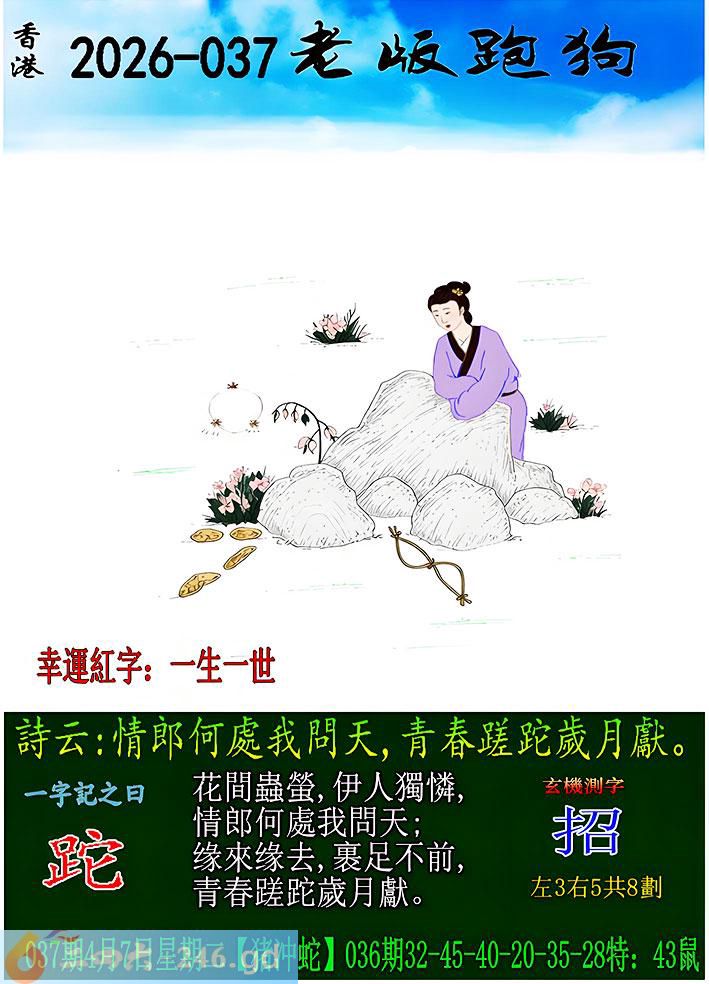 037期老版跑狗一字記之曰:【跎】 詩雲:情郎何處我問天,青春蹉跎歲月獻。