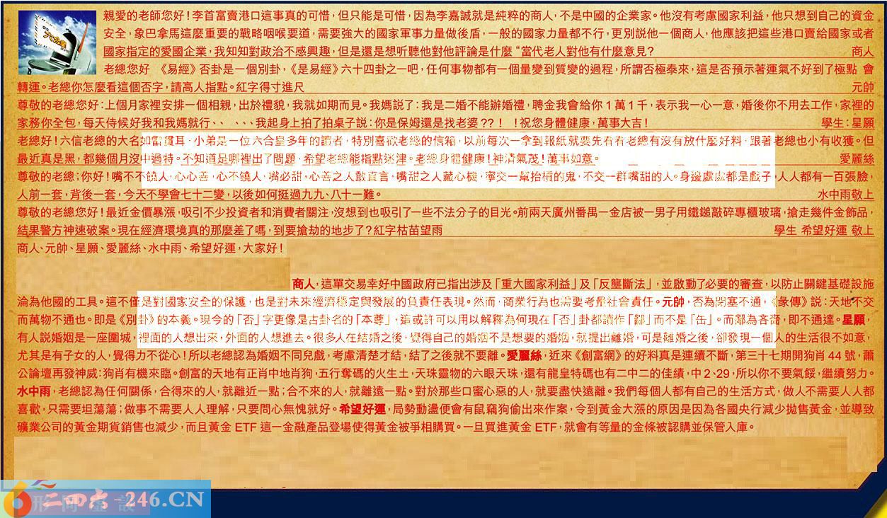 第042期《六合皇信箱文字版》10000%正確!!!正版二四六論壇*精心製作!!! 商人、元帥、星願、愛麗絲、水中雨、希望好運,大家好! 【1】.親愛的老師您好!李首富賣港口這事真的可惜,但只能是可惜,因為李嘉誠是純粹的商人,不是中國的企業家。他沒有考慮國家利益,他只想到自己的資金安全,象巴拿馬這麼重要的戰略咽喉要道,需要強大的國家軍事力量做後盾,一般的國家力量都不行,更別說他一個商人,他應該把這些港口賣給國家或者國家指定的愛國企業,我知知對政治不感興趣,但是還是想听聽他對他評論是什麼“當代老人對他有什麼意見?商人 〖商人〗:這單交易幸好中國政府已指出涉及「重大國家利益」及「反壟斷法」,並啟動了必要的審查,以防止關鍵基礎設施淪為他國的工具。這不僅是對國家安全的保護,也是對未來經濟穩定與發展的負責任表現。然而,商業行為也需要考量社會責任。 【2】.老總您好《易經》否卦是一個別卦,《是易經》六十四卦之一吧,任何事物都有個量變到質變的過程,所謂否極泰來,這是否預示蓍運氣不好到了極點會轉運。老總你怎麼看這個否字,請高人指點。紅字得寸進尺元帥 〖元帥〗:否為閉塞不通,《彖傳》說:天地不交而萬物不通也。即是《別卦》的本義。現今的「否」字更像是古卦名的「本尊」追或許可以用以解釋為何現在「否」卦都讀作「鄙」而不是「缶]。而鄙為吝嗇,即不通達。 【3】.尊敬的老總您好:上個月家裡安排一個相親,出於禮貌,我就如期而見。我媽說了:我是二婚不能辦婚禮,聘金我會給你1萬1千,表示我一心一意,婚後你不用去工作,家裡的家務你全包,每天侍候好我和我媽就行、、、、、我起身上拍了拍桌子说:你是保姆還是找老婆??!!祝您身體健康,萬事大吉!學生:星願 〖星願〗:有人說婚姻是一座圍城,裡面的人想出來,外面的人想進去。很多人在結婚之後,覺得自己的婚姻不是想要的婚姻,就提出離婚,可是離婚之後,卻發現一個人的生活很不如意,尤其是有子女的人,覺得力不從心!所以老總認為婚姻不同兒戲,考慮清楚才結,結了之後就不要離。 【4】.老總好!六信老總的大名如雷貫耳,小弟是一位六合皇多年的讀者,特別喜歡老總的信箱,以前每一次拿到報紙就要先看看老總有沒有放什麼好料,跟著老總也小有收獲。但最近真是黑,都幾個月沒中過特。不知道是那裡出了問題,希望老總能指點迷律。老總身體健康!神清氣茂!萬事如意。愛麗絲 〖愛麗絲〗:近來《創富網》的好料真是連續不斷,第三十七期開狗肖44號,蕭公論壇再發神威:狗肖有機來臨。創富的天地有正肖中地肖狗,五行奪碼的火生土,天珠靈物的六眼天珠,還有龍皇特碼也有二中二的佳績,中2、29,所以你不要氣餒,繼續努力。 【5】.尊敬的老總:你好!嘴不不饒人,心心善,心不饒人,嘴必甜,心善之人敢直言,嘴甜之人藏心機,寧交一幫抬槓的鬼,不交一群嘴甜的人。身邊處處都是戲子,人人都有一百張臉,人前一套,背後一套,今天不學會七十二變,以後如何挺過九九、八十一難。水中雨敬上 〖水中雨〗:老總認為任何關係,合得來的人,就離近一點,合不來的人,就離遠一點。對於那些口蜜心惡的人,就要盡快遠離。我們每個人都有自己的生活方式,做人不需要人人都喜歡,只需要坦蕩蕩;做事不需要人人理解,只要問心無愧就好。 【6】.尊敬的老總您好!最近金價暴漲,吸引不少投資者和消费者關注,沒想到也吸引了一些不法分子的目光。前兩天廣州番禺一金店被一男子用鐵縋敲碎專櫃玻璃,搶走幾件金飾品,結果警方神速破案。現在經濟環境真的那麼差了嗎,到要搶劫的地步了?紅字枯苗望雨學生希望好運敬上 〖希望好運〗:局勢動盪便會有鼠竊狗偷出來作案,令到黄金大漲的原因是因為各國央行減少拋售黃金,並導致礦業公司的黃金期貨銷售也減少,而且黃金這一金融產品登場使得黃金被爭相購買。一旦買進黃金,就會有等量的金條被認購並保管入庫。 紅字:形同虛設 暗码:05123444 [释义]形式上虽有,却不起作用。 [出处]《雅舍小品·不亦快哉》。