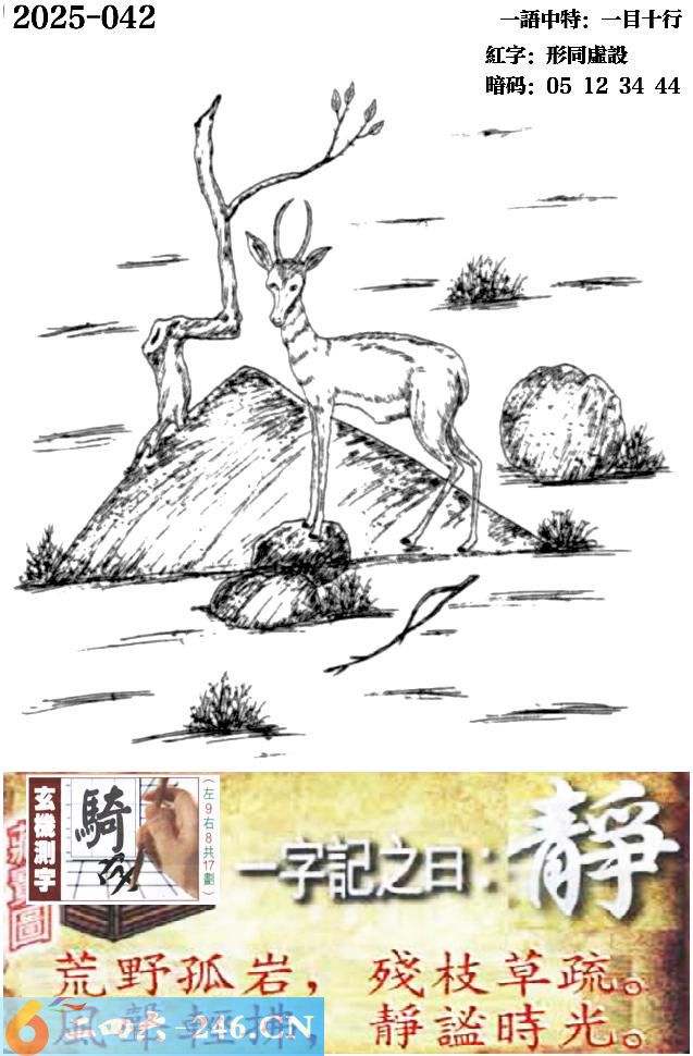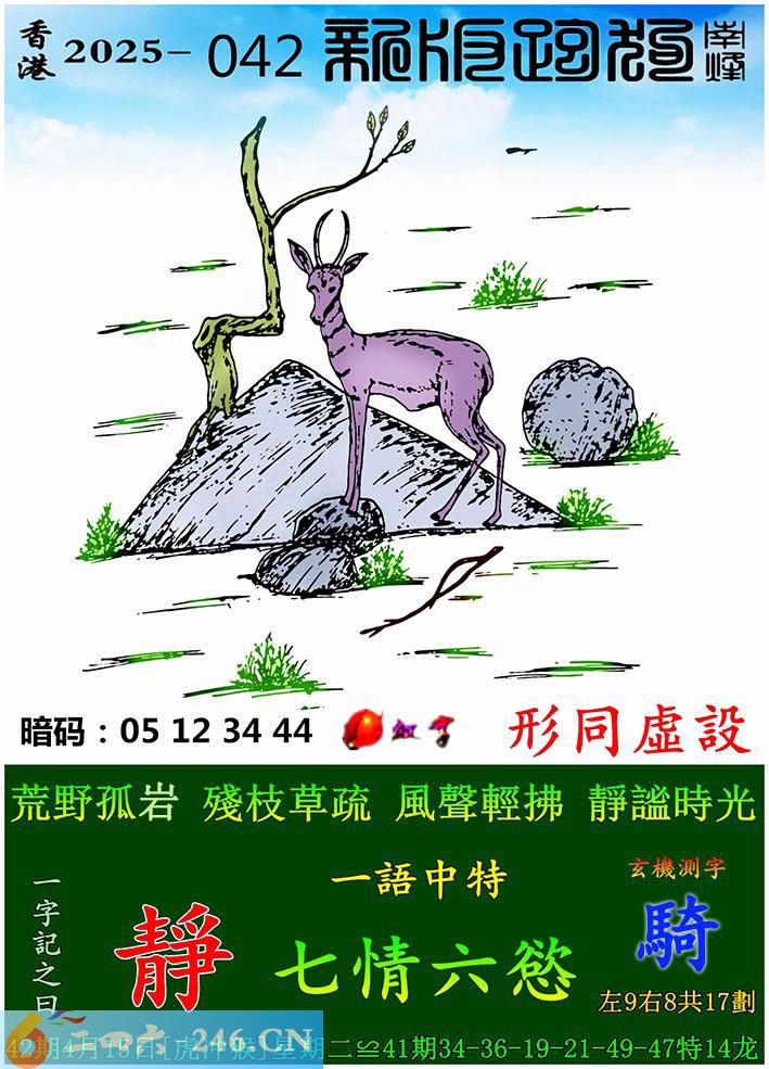 042期跑狗一字記之曰:【靜】 荒野孤岩,殘枝草疏。 風聲輕拂,靜謐時光。 玄機測字:《騎》 一語中特:七情六慾